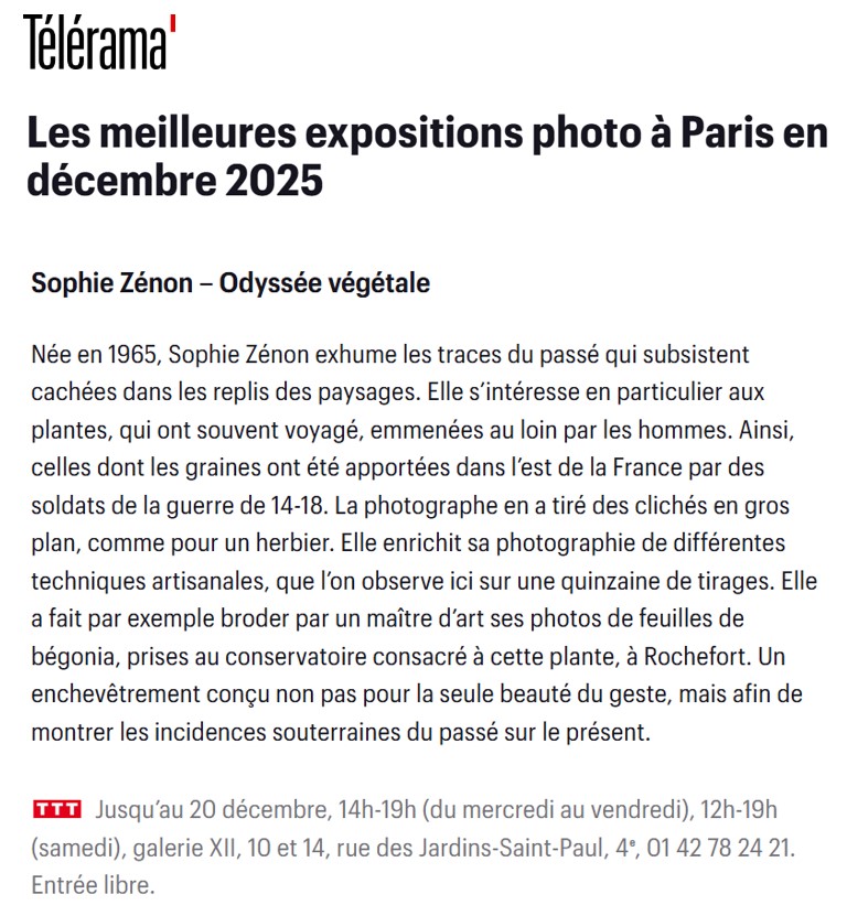 Vous vous souvenez ? L’Odyssée Végétale, exposition de notre atelier cet été pour célébrer ses 30 ans ? Exposée désormais à Paris, Galerie XII, jusqu’au 20 décembre 2025 avec d’autres œuvres de Sophie Zénon, elle fait l’objet d’une critique élogieuse dans la revue Télérama’ (recommandation TTT).