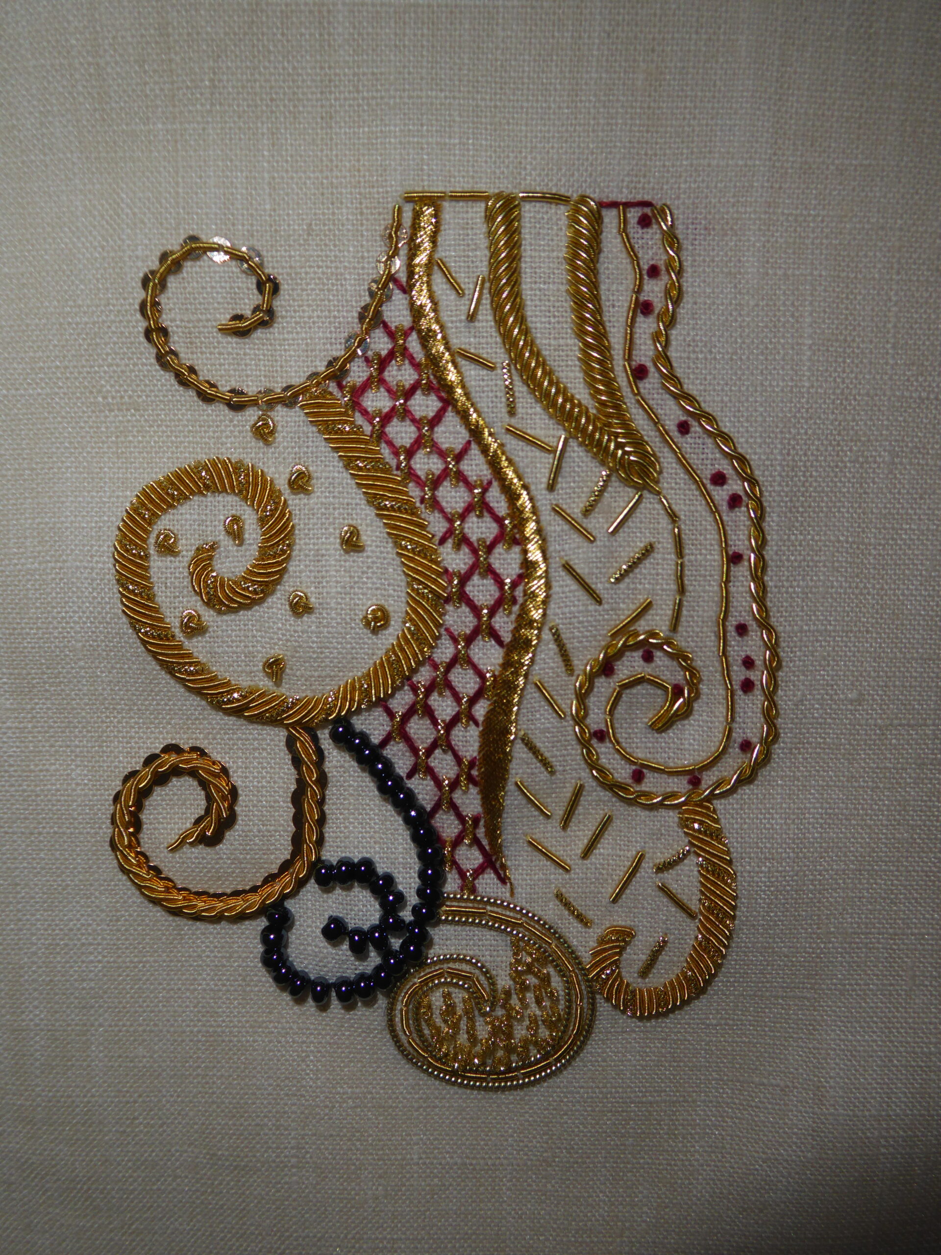 Comme toujours, cannetille et jaseron, perles, paillettes … sont d’une qualité exceptionnelle et confère à la broderie tout l’éclat qu’elle mérite.