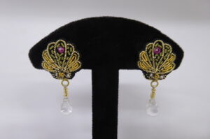 L’excellence à prix tout doux. Fond de fine suédine noire dotées d’un clip en acier chirurgical pour oreilles non percées . Ces boucles d’oreille accrochent la lumière grâce à ses matières riches et colorées. Le contour est réalisé en jaseron or et cristal de Bohème brodés, ainsi que des « copeaux de cannetille or, et couleur. […]