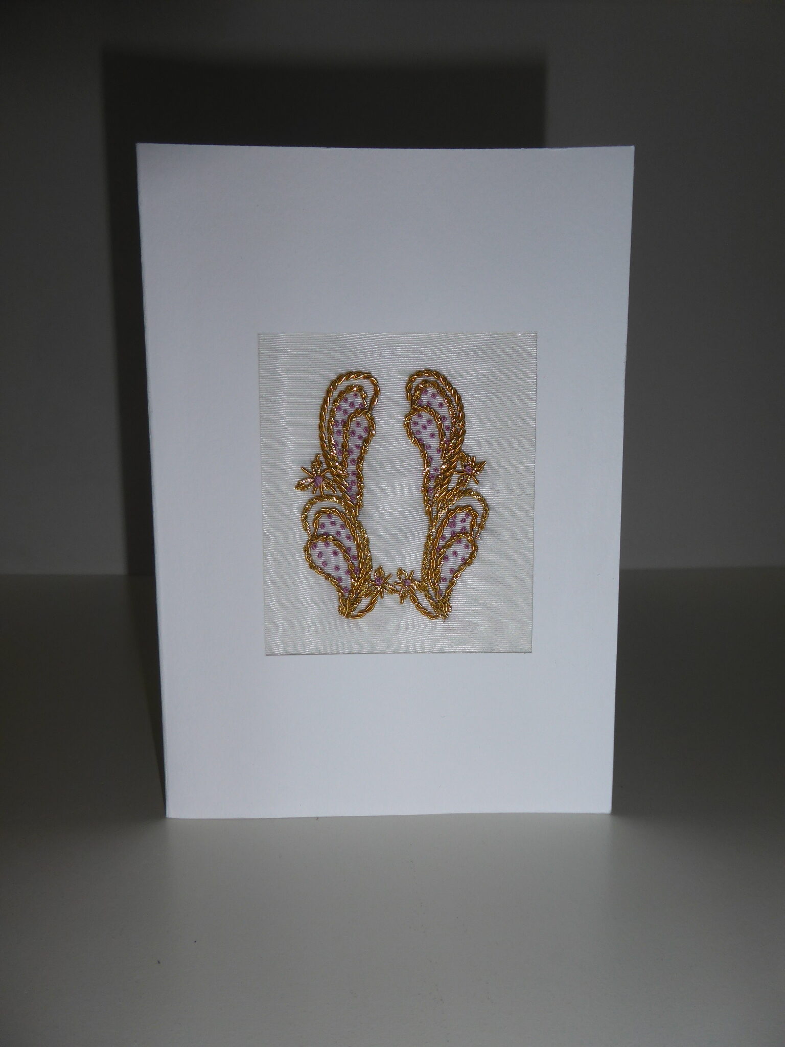 Lin blanc, cannetille or et argent mate, brillante, frisée, jaseron argent, paillettes or et argent, filé or, coton DMC couleur, fil chiné argent et noir.